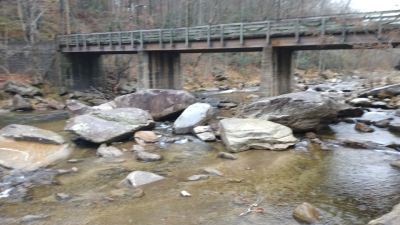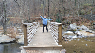 Also called the Rocky Broad Riverwalk, Rosie found this .5-mile trail downtown which hugged and sometimes crossed the Broad River. Due to the lack of rain the Broad River was not very deep nor flowing rapidly over the many large and small rocks that rimmed the curving river. Still, it was a pleasant hike past the rear entrances of coffee shops, restaurants, craft shops and small lodges. Along the trail one sign warned us that black bears have been seen in the area and to beware of water snakes. In some places, beautiful Christmas lights accented the trail, the wooded area, and some of the stone houses. It was a short but enjoyable hike.
