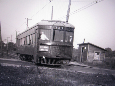 The trolley was a Cincinnati and Lake Erie (C&LE line) whose maintenance building was located just west of today’s Springboro Pike and Main Street intersection (see photo). The C&LE was a short lived electric high speed interurban streetcar/trolley railway that operated from 1930 to 1939 in Depression era Ohio. C&LE ran twenty high speed “Red Devil” interurban passenger cars between Cincinnati, Dayton, Columbus & Toledo. Red Devils were power efficient, lighter (among the first to be constructed with aluminum), passenger comfortable (with leather seats, toilet, luggage compartment) seating up to 44 people.