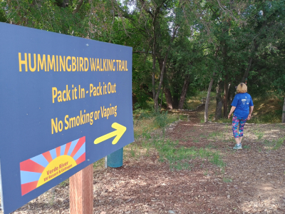 This short trail was very pretty among shade trees and along a small creek. Periodically erected along the trail were humming bird feeders and colorful bird yard art. We did see several hummingbirds as we hiked.