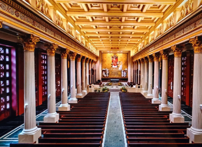 The towering Byzantine mosaic behind the alter depicts Jesus bestowing the “power of the keys” upon Saint Peter. The two smaller mosaics show Peter imprisoned. The two paintings are the two newly recognized Saints. Its single spire made of white limestone, rises 224 feet above street level making it the tallest man-made structure in Cincinnati for decades. The church has 33 columns, symbolizing Jesus’s 33 years of life. In 2025, we attended a special mass here for survivors of suicide loss administered by Archbishop Robert Casey. The choir was outstanding.