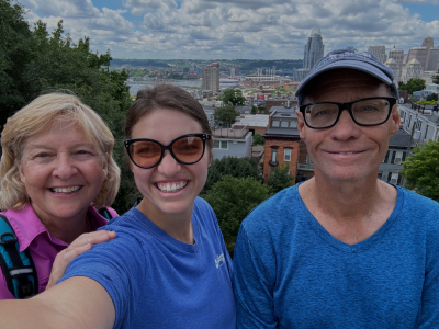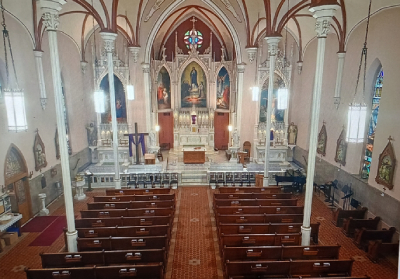 Sitting atop Mount Adams on Guido Street, this limestone church constructed by stone quarried from the slopes, gives a spectacular panoramic view of downtown Cincinnati and the Ohio River. The church was built in 1859. It is small but has seven beautiful paintings by Johann Schmitt which hang over the main altar and side altars. The church has the nickname, “Church of the Steps”, for its 96 steps leading up to its entrance. It is known for its Good Friday Pilgrimage in which parishioners say prayers on each step until they reach the summit. We began at the church to walk behind Jesus 1.6 miles downtown to the Cathedral Basilica, this was part of the National Eucharistic Procession going across the country to Indianapolis.