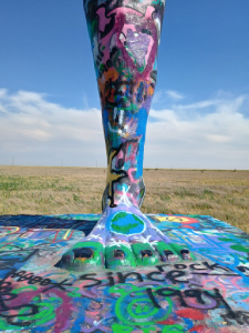 Like Ozymandias, a large pair of legs in the Egyptian desert, an artist built these 38-foot legs in 1996. They have been spray painted over many times. Holly and I squeezed through the gate, and I posed on the structure.
