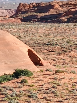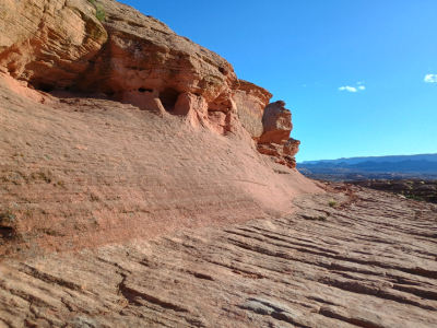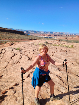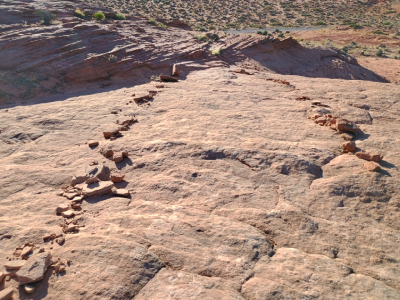 This 1.9-mile trail in the Glen Canyon National Recreation Area was challenging because it was 95% on rock shelves, wind carved sandstone, and slickrock formations so I had to constantly look for cairns to stay on the trail. This trail reminded me of the beehive rocks at Valley of Fire Trail in Nevada. The trail was wrapped around a high rock spire called the Shiva-Nandi Rock and eventually came to The New Wave (Photo#4), a whirlpool looking spiral rock design. Looking out in the desert reminded me of a past Twilight Zone episode where astronauts were lost after crash landing their rocket ship. Later, we came to some pretty wildflowers above a cliff area. The trail descended back down to the desert floor for the final .1 mile.