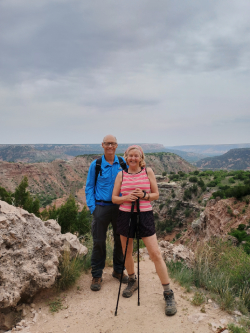 Justin and Holly flew to Amarillo and drove to our nearby campsite to surprise Rosie for Mother’s Day. I had purchased a two-day pass for the Palo Duro Canyon which is called the “Grand Canyon of Texas” and is the second largest canyon in the USA (the Grand Canyon is the largest). We drove 25 miles south of Amarillo in the Texas Panhandle and toured the visitor center to read the educational and historic exhibits. The center overlook gave us a majestic view of the canyon which is 6 to 20 miles wide. We walked over to the trailhead which took us along the rim for a while before we began our descent into the canyon. As we carefully descended 500 feet to the canyon floor, we crossed four historic Civilian Conservation Corps bridges, past four geologic layers, multicolored layers of rock, a few hoodoos and saw numerous wildflowers, sage, scrub plants and lizards. About 1.4 miles later we were at the canyon bottom where we found a small visitor center/gift shop, restrooms and the Pioneer Amphitheater where they hold an outdoor musical drama in the summertime. After drinking some water, we began the grueling 1.4 miles back up the canyon trail. It was getting hotter as we slowly hiked up towards the distant rim. Occasionally on a canyon overlook there was a good refreshing breeze.