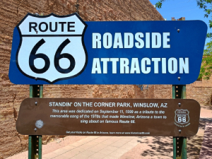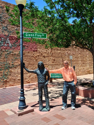 The famous hit Eagles song entitled “Take It Easy” included these famous lyrics written by Jackson Browne. So, we parked our travel trailer a few blocks away and walked down to “the corner”, officially called The Standing on the Corner Park located on Route 66. The Eagles music was playing on loudspeakers and in the stores. On the corner was a statue of Glenn Fry and Don Henley, plus a colorful mural of a girl in a flatbed ford, eagles wings and other historic memorabilia. Several stores on the corner sold Eagles souvenirs and CD’s. We ordered lunch at a restaurant across from the corner called the Sipp Shoppe where I had a Reuben sandwich and a root beer float. We sat outside eating, people watching and enjoying the music. One tourist who looked like Joe Walsh posed with other tourists while holding a guitar. While we ate, over a hundred people came and went, taking photos of this corner park. If it wasn’t for the song lyrics, there was nothing in Winslow that I saw to attract tourists. So, this corner was quite the gold mine for this little city.