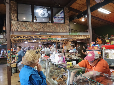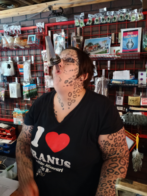 The 30th day of our trip and we were back in Uranus. I wanted to talk to Mayor Louie, but he was working at the Indiana Uranus. I bought some fudge from the Uranus Fudge Factory. We walked down and bought two tickets from Katya and entered the circus sideshow. Rosie got grossed out from the beginning. The sideshow had many two-headed animals on display including two sets of turtles conjoined at the shell. Several fictious cryptozoology creatures made me laugh. Overall, it was quite “educational” and enjoyable. We exited and bought four gag gifts to mail to Aunt Tina. We talked to Katya for a while, who had dozens of tattoos on her body, neck and face. Katya was holding a sword that Rosie thought she might stab at us. Instead, she asked if we wanted to see a trick. She lifted the sword, opened her mouth and swallowed it before pulling it back out of her throat. Katya was a sideshow sword swallower. We were impressed. Rosie bonded with her after that.