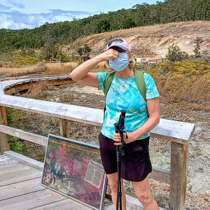 After hiking the Crater Rim Trail at 3,980 feet for several miles, we connected with the one-mile Sulphur Banks Trail just north of the Kilauea Caldera. After passing many steam vents we entered an area of hot, colored rocks and boiling sulfur pits which reminded us of the Yellowstone Park boiling mud pots and sulfur pits. The hydrogen sulfide gas smelled like sulfur and rotten eggs. Rosie said that it also smelled like my dirty, sweaty hiking socks. I took that as a compliment. A half mile down the trail it abruptly changed back to jungle and greenery again.