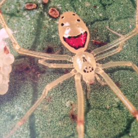 Our first hike at the national park. The trail began at 7,990 feet. as we were higher than the cumulus clouds. The trail was rocky 2.3 miles out and back trail with a 400-foot elevation change. We ended up at a viewpoint of the crater. Two couples from Canada took our photos on the rim.  In the distance I could see the extension of this trail switchback down the crater wall and cross the crater for another six miles. One great find: as I was looking through the silversword plants and spider webs just off the trail, I spotted a happy face spider (Photo#4).