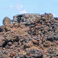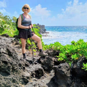 This state park trail was one of our top two favorite trails of the trip. First, we crossed Pa’iloa Beach, a 100-foot-wide black sand beach (Photo#7) where people swam. We ascended a rock trail about 50 feet and the coastal trail began – a 4.2-mile out and back trail along the coast over hard black lava. To the background of tremendous, big waves smashing against the coastal rocks, we slowly hiked up and down across the unforgiving lava. Inland there was a thick growth of Hala trees. Additional signs of green life, lichen and plants were everywhere, fighting to penetrate the black lava and reach lifegiving air and water. After a mile we reached the small stone foundation of an ancient temple (Photo#9).