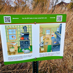 This Miami County Park District Preserve was just west of I-75, but you would never have guessed. It was rural, quiet and peaceful on this sunny fall day. The park was reclaimed agricultural land that was a combination of wetlands, open prairie and woodland. The 2.1-mile hike encompassed several trails. The first trail took us to a prairie loop called Pheasant Crossing with tall grass and wildflowers. The second trail took us past an overlook of the wetlands pond where we sat on a bench and listened to the birds and ducks. The Bobwhite Loop Trail took us around more prairie. Along this trail we came to ten signs telling a fictional story with a bird featured on each sign. Using the QR Code on the sign, you could listen to the real chirping sound of each specific bird. Near the end we entered the only tree covered area of the preserve.