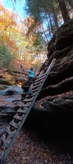 After lunch in nearby Rockville at 36 Saloon with friend Roger Jeffers (thank you Roger for treating us), we returned to the state park, ascended 70 steps and crossed fast flowing Sugar Creek. We plan to return next year and kayak the creek. We hiked west on trail #3, turned north and entered Bear Hollow.  Once again temperatures dropped significantly as we wormed our way through this tight hollow with rock formations on each side. Several areas were very tight, and we had to climb precarious, thin rock ledges to move on down the “mini canyon”. At the end of the hollow, we climbed two sets of ladders to emerge to higher ground. The trail was now back to a high canopy forest with beautiful fall leaf colors but had several steep hills, one of which was the infamous “140 steps” which was a tough climb. We took Trail #10 north to “Camel’s Back”. Peering across the valley into a distant hill it looked like the rocks on the ridge resembled a camel’s back. A long hike back south eventually brought us back to the suspension bridge. Once across the bridge it was a short hike before we ascended the tough 70 steps for the third and final time. He hiked a total of 4.5 miles on this afternoon (7.3 for the day) adventure, and our legs were tuckered out. This state park was as pretty and as challenging as our friends told us.