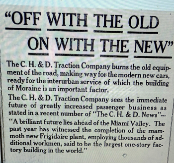 Following the dinner, the large delegation boarded special traction line trolley cars and headed to a fireworks demonstration – planned to herald the company’s new improvements with an event dramatic enough to stir the imagination of the press and public alike. As the guests and the crowd of 25,000 assembled in a field just south of where today’s Moraine Walmart is located, C, H & D gave away free popcorn and ice cream and hired stunt pilots from Wright Field to put on an aerobatic show while a band played music. The Big Show aka The Big Cremation – bodies of the seven old wooden traction cars were placed end to end in a field in Moraine and given the torch. The cars were filled with kindling soaked in gasolene. The blaze could be seen for miles and burned over an hour. C, H & D management’s symbolism literally reduced the past to ashes and started anew with new trolley cars. It was quite the 1920’s marketing ploy.