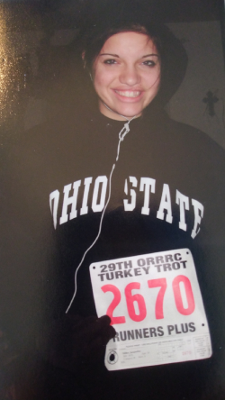 This was always a memorable, fun family race. This 3.1-mile race was always had 1,000 runners as a Halloween costume contest was held before the race and runners could also run in costumes if they wished. The race began at the Downtown Dayton YMCA (pre-Riverscape Metropark), ran north on Riverside Drive, across Helena Street Bridge and then back south on the luminary lite bikeway. On October 23, 2001, at age 10 this was Matt’s first 5K run ever. Matt ran 31:50. We would celebrate with twinkies after the race because Hostess Cakes was one of the sponsors. Holly loved this race, seeing runners in costume but her best memory was the free Dominos pizza and cookies after the race. Jacque remembers the race sometimes being cold and dark when she finished but the post-race food and hot pizza made up for it. In high school Jacque looked like movie star Angelina Jolie so several runners thought that Jacque was her or dressed up like her. Jacque and the kids remember one year that Rosie dressed up as an annoying clown and carried plastic clapper hands. Jacque said the clapping and moms annoying comments bothered everyone the entire race. All runners always received a nice warm sweatshirt as part of the entry fee. One photo shows Rosie (far left) in the pre-race costume contest. As for placing, we always treated this as a family fun run and jogged with the kids except in 1988 when Rosie finished as the 10th woman overall with a time of 57 minutes 31 seconds.